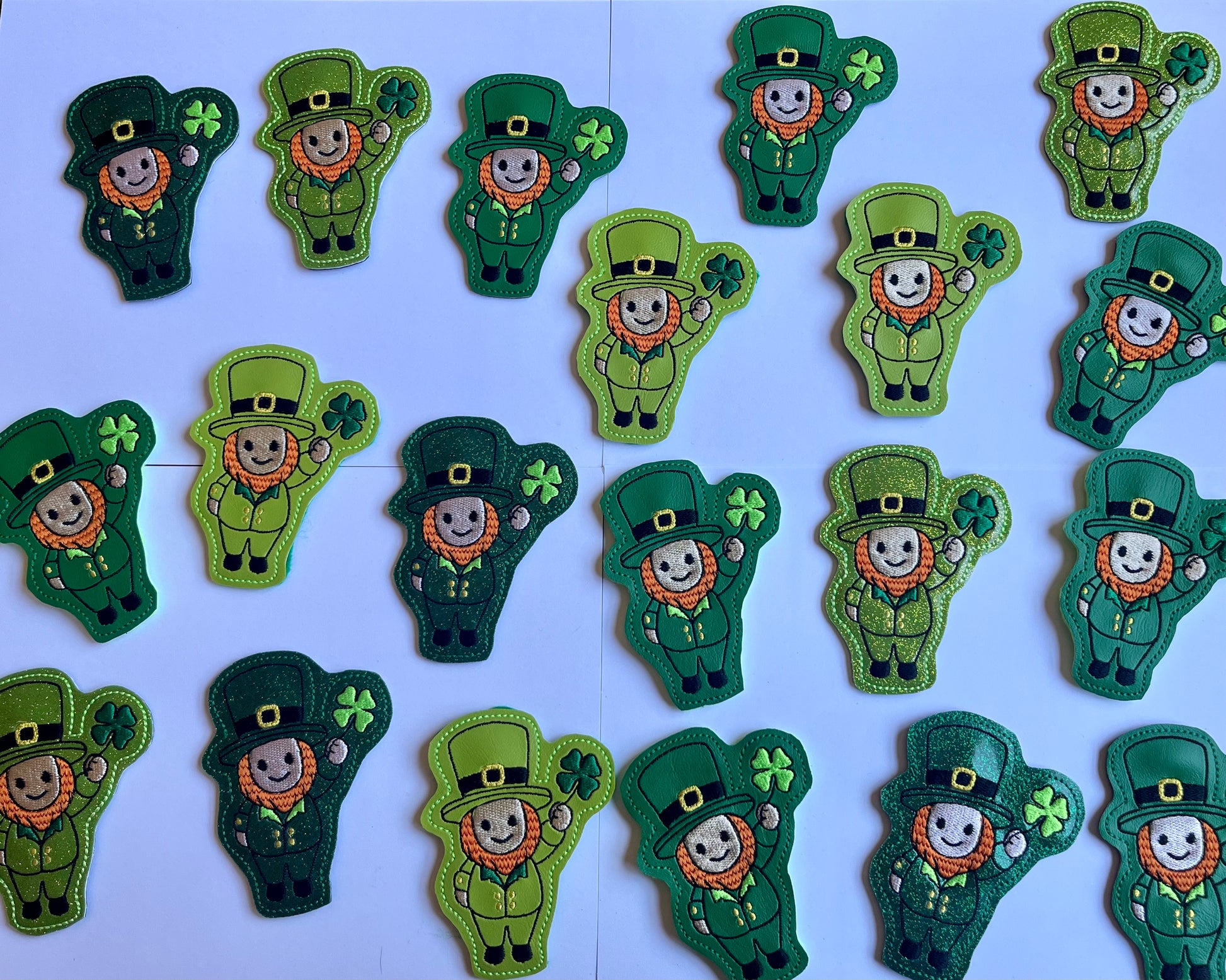 These leprechaun pocket pals are perfect for slipping into leprechaun traps. They are embroidered on vinyl and backed with felt. You can choose between 2 shades of green and a glittery or matte finish.