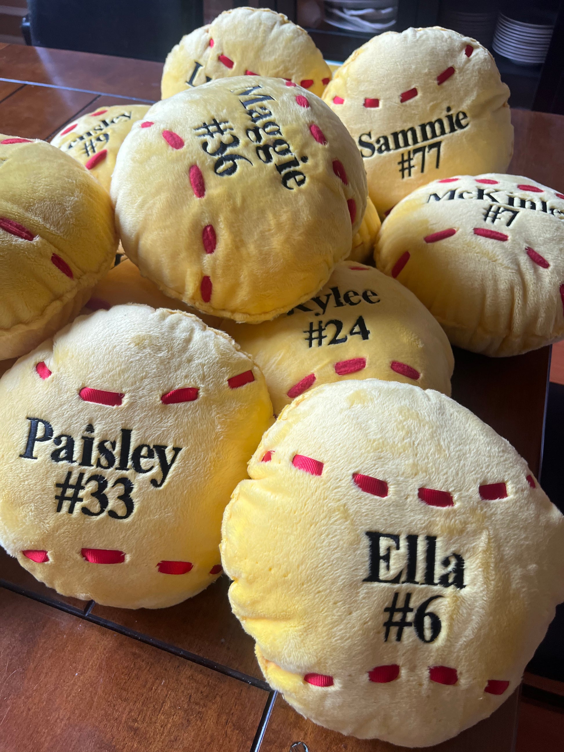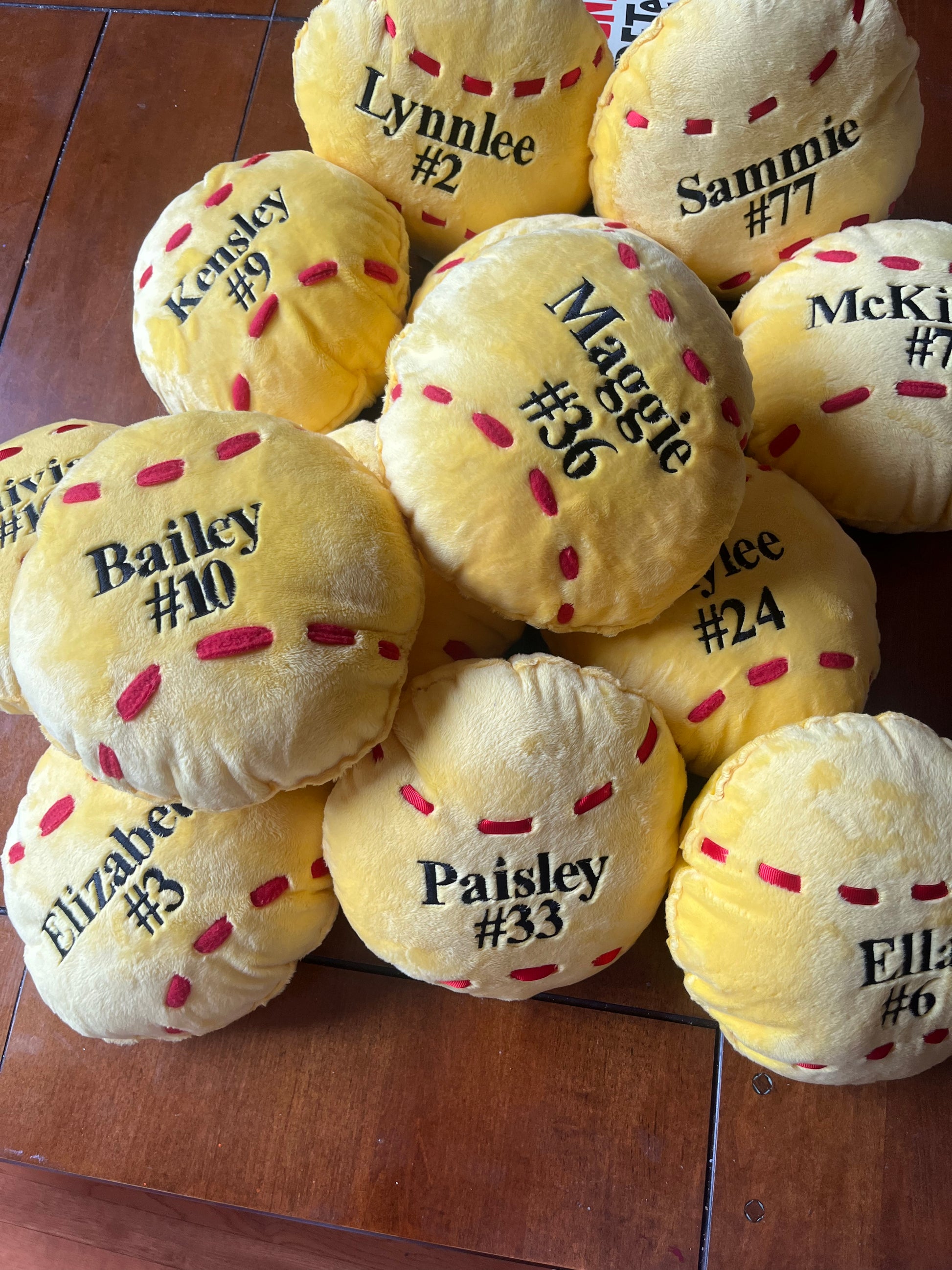 This round plush pillow will be handmade in your choice of colors (yellow for softball and white for baseball...other sports balls coming soon). These make perfect travel pillows for the car or decor for your player's bed at home! This pillow is made from high-quality fleece that is super soft and can be customized with your player's name and/or number.